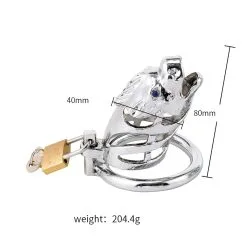 Cette cage de chasteté se porte presque comme un bijou. Sa forme est définitivement originale puisqu’elle représente la tête d’un dragon. L’extrémité est ouverte, pas de problème d’hygiène ou de besoins, tout peut être fait sans enlever la cage.