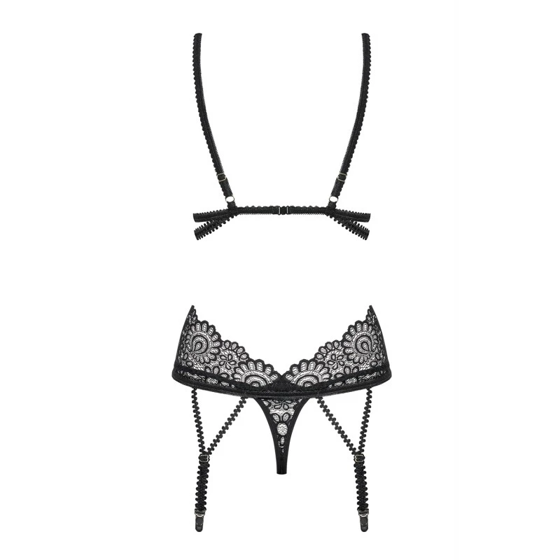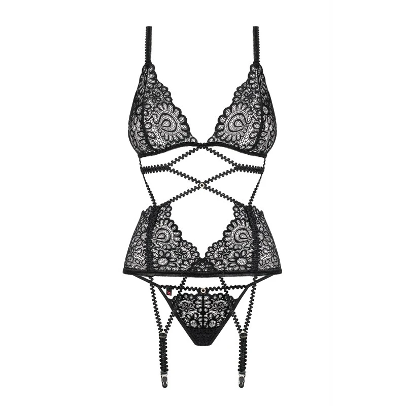 Entre la dentelle noire à bord découpé qui vient souligner vos courbes et le jeu des galons élastiques qui dessinent sur le corps un entrelacement de désir, votre partenaire ne saura plus où donner de la tête (et des yeux) !
