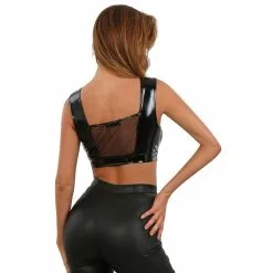 Conçu à la fois en vinyle et en maille, il laisse entrevoir un large décolleté.